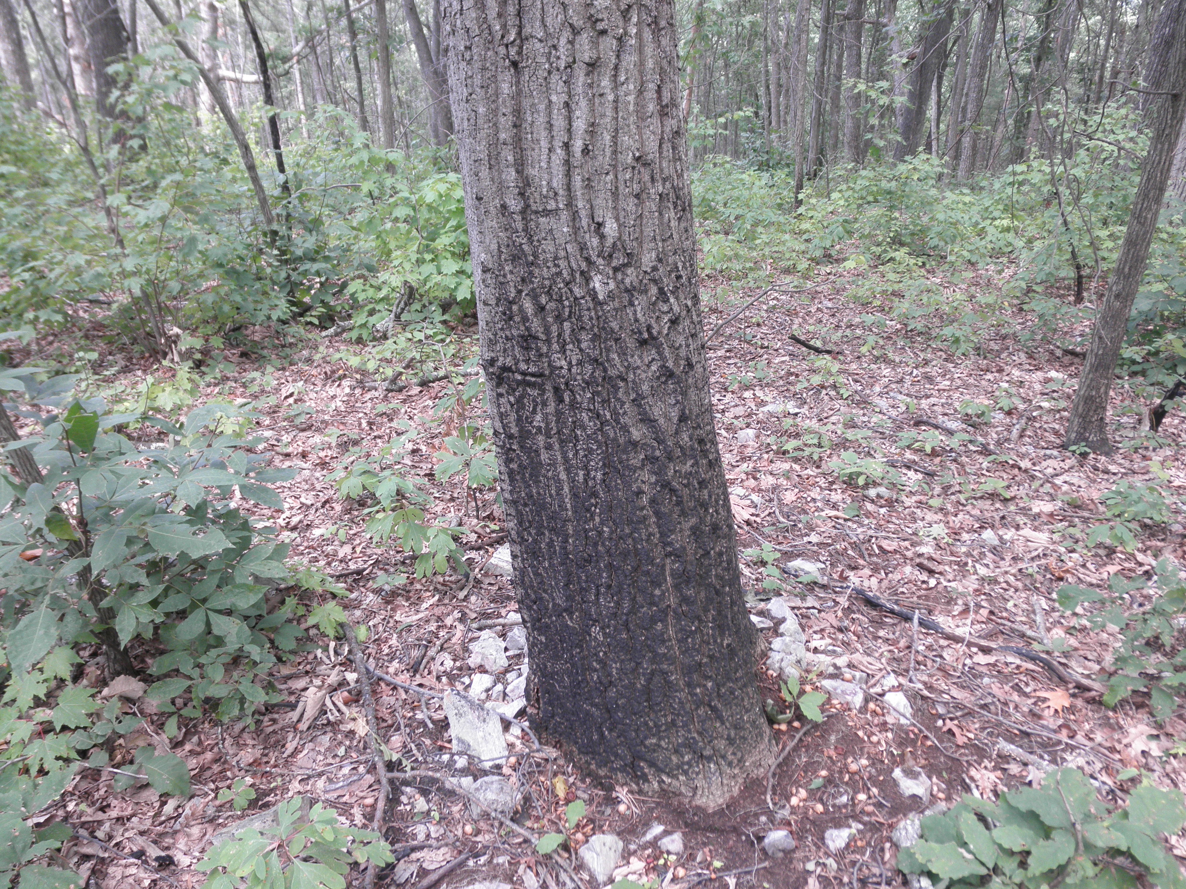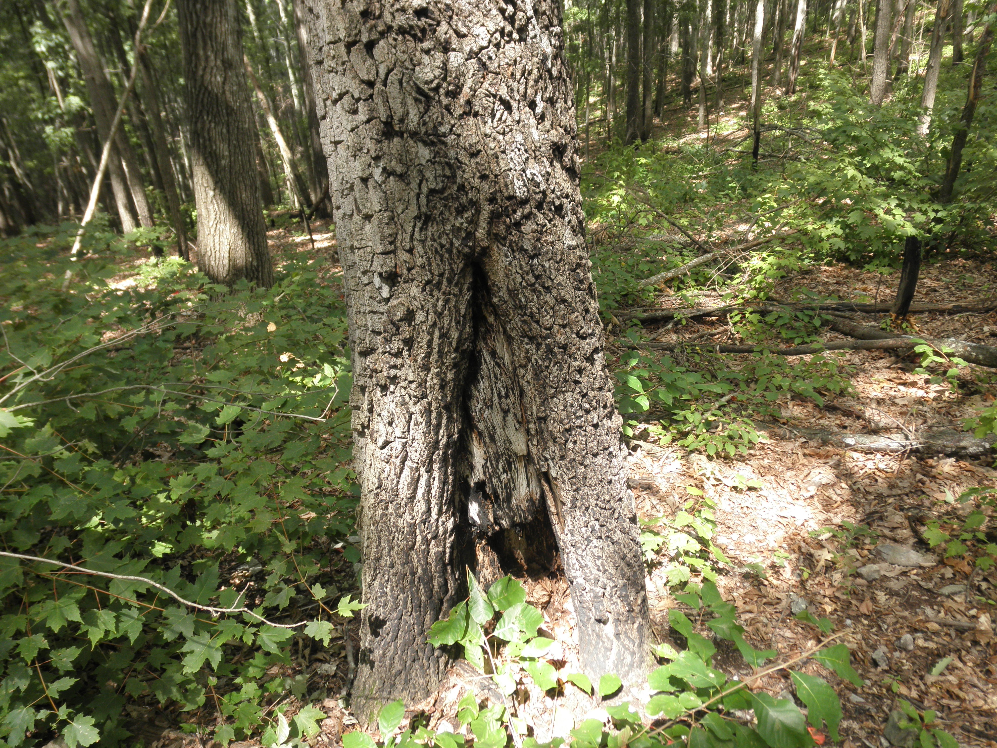 Here is another chestnut oak. This tree was not able to weather the fire like the one pictured above. The fire was hot enough to penetrate the bark and damage the cambium layer (growth tissue). You can now see where a fungus is growing on the outside of the bark and is most likely working on digesting a portion of the tree.